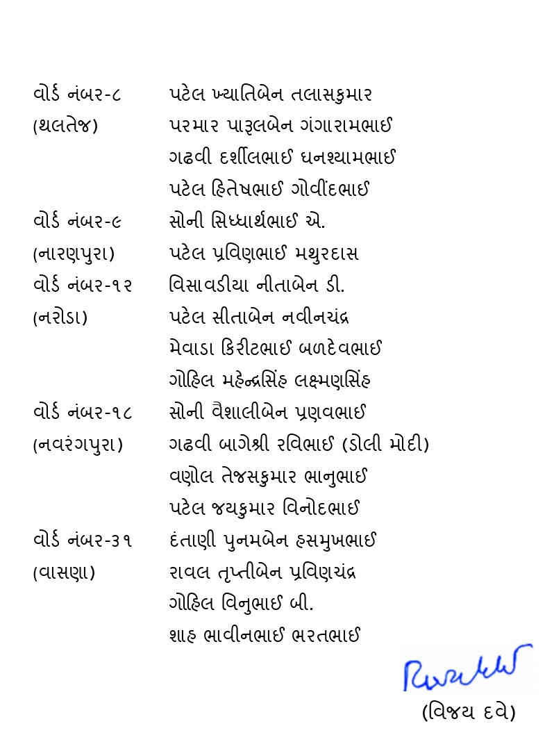 કોંગ્રેસ દ્વારા આજે 2 ફેબ્રુઆરીએ ગોતા, ચાંદલોડિયા, રાણીપ, નવા વાડજ, ઘાટલોડિયા, નરોડા, થલતેજ, વાસણા, નવરંગપુરાની આખી પેનલ જાહેર કરી હતી. જ્યારે નારણપુરા વોર્ડમાં માત્ર 2 જ ઉમેદવાર જાહેર કર્યા છે.