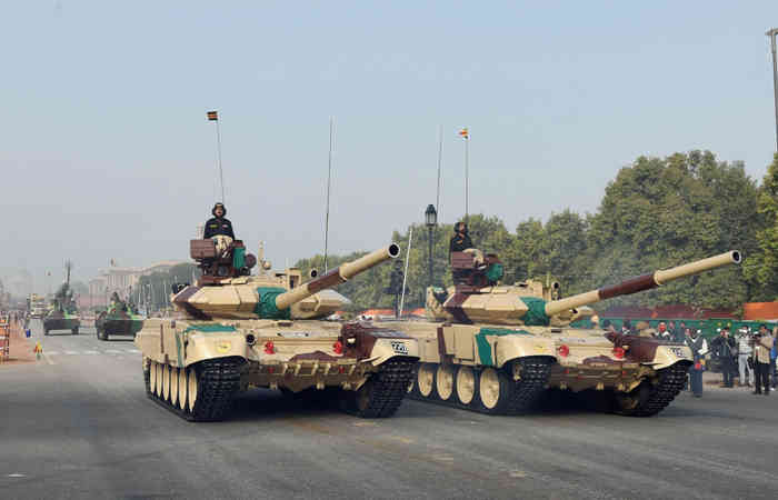 સૌથી પહેલા રાજપથ પર યુદ્ધ ટેન્ક ટી-90એ પોતાની તાકાત દેખાડી. આ મુખ્ય યુદ્ધક ટેન્ક, હંટર-કિલર સિદ્ધાંત પર કાર્ય કરે છે. આ 125 મિમીની શક્તિશાળી સ્મૂથ બોર ગન, 7.62 મિમી કો-એક્સિલ મશીન ગન અને 12.7 મિમી વિરોધી વિમાન ગનથી લેસ છે.